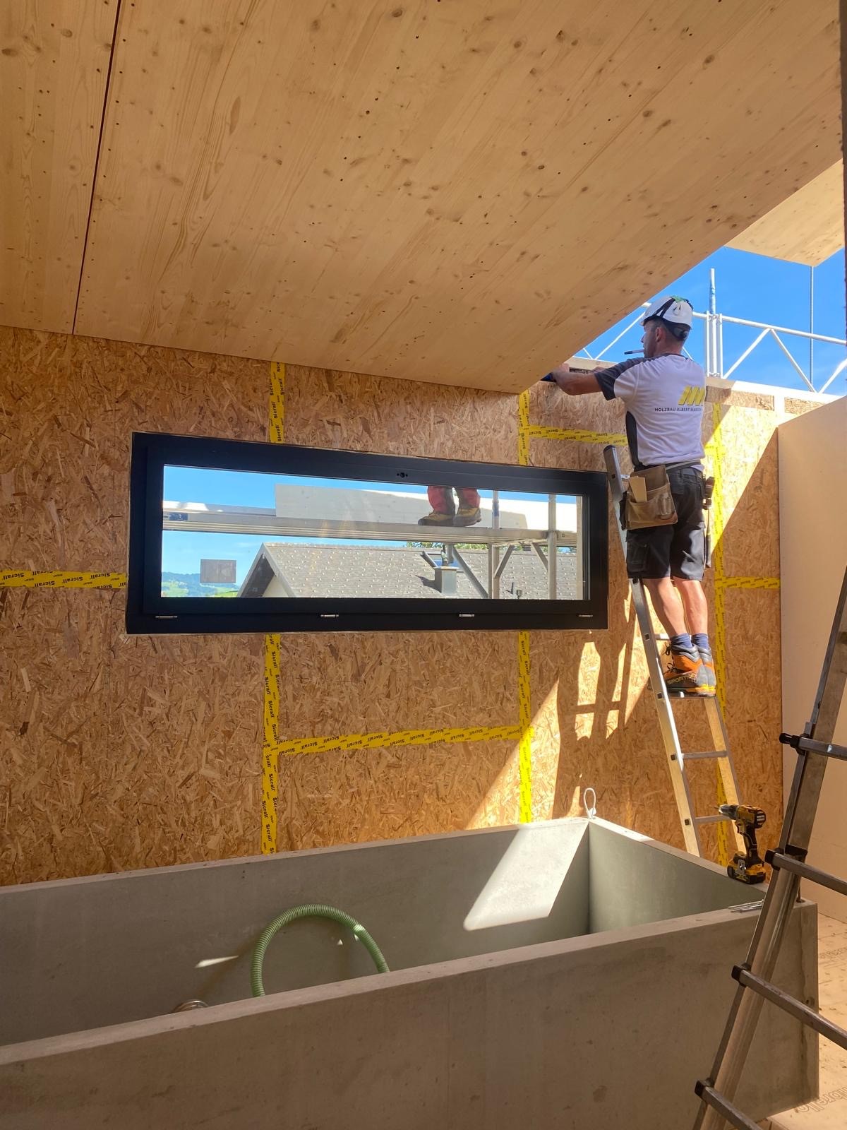 - Die Bodenplatte ist das einzige betonierte Element, während das Gebäude in klassischer Elementbauweise vollständig aus Holz errichtet wird, einschließlich des Liftschachts und des Treppenhauses.