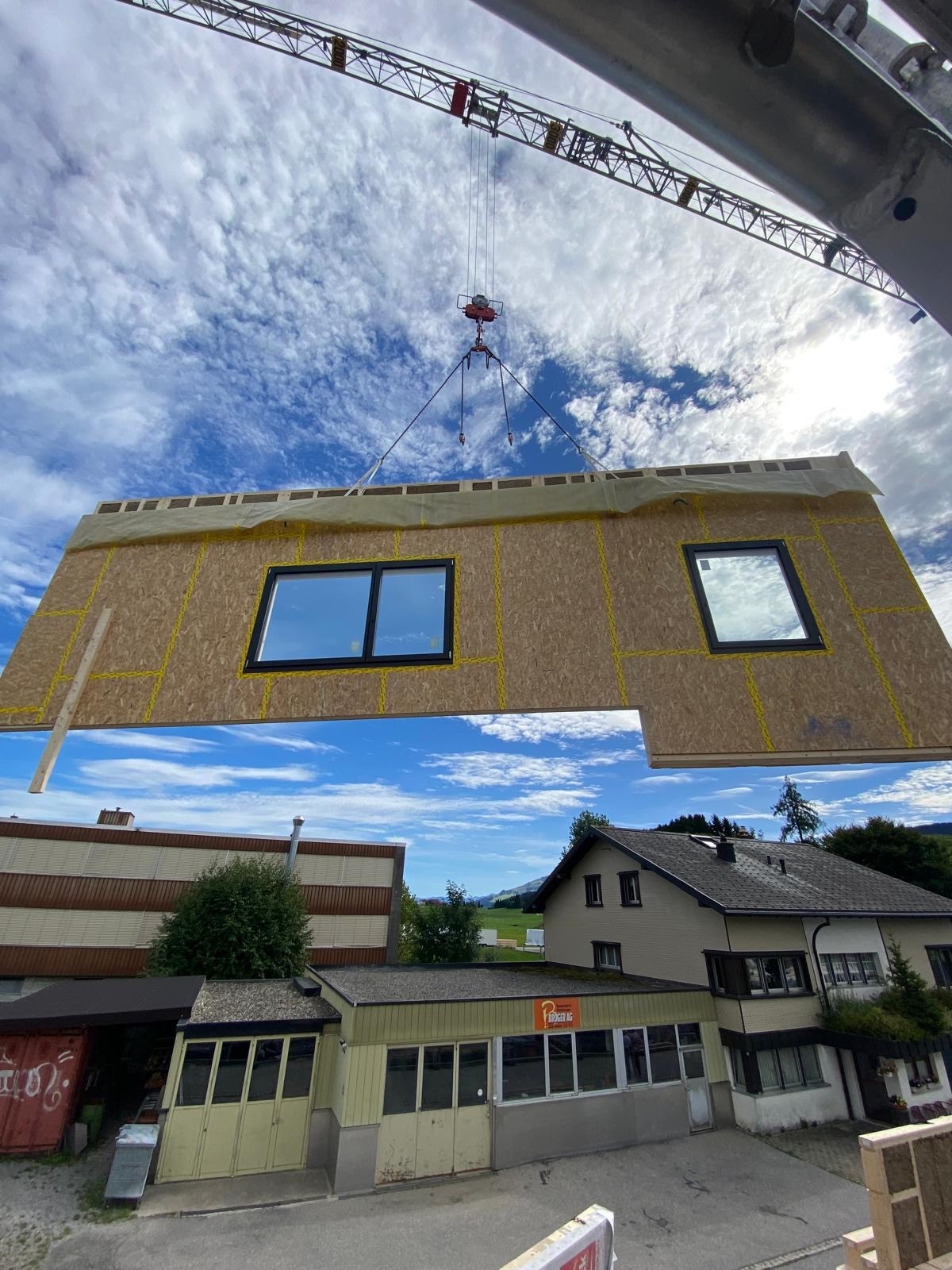 Der Kran wird aufgestellt, die erste Etappe vom Holzelementbau ist in vollem Gange.